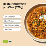 Mit 570 g pro Glas sind unsere Classic Gerichte deutlich größer als übliche Fertiggerichte. Ein Glas enthält zwei Portionen.Unsere Chunky Bowls enthalten eine Portion pro Glas (380g).