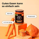 An Linsen wird immer wieder kritisiert, dass sie langweilig oder gar fad schmecken würden. Hier möchten wir entschieden widersprechen. Wie bei jedem Nahrungsmittel hängt der Geschmack maßgeblich von der Zubereitung desselben ab. Mit Sicherheit gibt es Linsen Rezepte, die durch eine eintönige Wahl an Zutaten etwas öde schmecken. Nicht aber unsere Linsen à la Provence. Dieses Fertiggericht überzeugt mit einer Vielfalt an Aromen. Durch den Einsatz von geschmackvollen Gemüsesorten wie Hokkaido Kürbis und Gewürzen wie Muskatnuss entsteht ein mediterraner Genuss, auf den wir stolz sind. Wir sind überzeugt, dass Rezepte mit Linsen gerade aufgrund ihrer starken Nährstoffbilanz ein großes Potenzial haben. Mit unseren Gerichten als Treibstoff sollst auch du dein volles Potenzial entfalten.