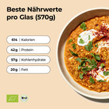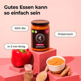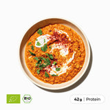 Ein Geschmack so gut, dass er dich in ein anderes Land versetzt. Orientalische Gewürze, rote Linsen, Hack aus Erbsenprotein und knackig-frische Paprika vereinen sich zu einem proteinreichen Bio-Gericht, das dir jede Menge Energie verleiht.