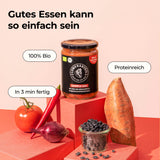 Viele Sportler achten bei der Zusammenstellung ihres Speiseplans auf einen hohen Proteingehalt. Nur so können sie ihre Muskeln dauerhaft mit dringend benötigten Eiweißen versorgen. Bei der Entwicklung unserer Fertiggerichte haben wir diese Tatsache berücksichtigt. So weist unser geliebtes Chili con carne beispielsweise einen überdurchschnittlichen Proteingehalt auf. Bei diesem Gericht stammt das Protein aus qualitativ hochwertigem Bio-Rindfleisch. Neben klassischem Rinderhack haben wir zusätzlich leckere Rinderknochenbrühe verwendet. So decken wir nicht nur deinen Proteinbedarf, sondern bescheren dir ein leckeres Geschmackserlebnis. Mit unserem Chili con carne bist du garantiert bereit für das nächste Workout und gibst deinen Muskeln genau das, was sie benötigen.