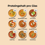 Linsen à la ProvenceZutaten: Tomaten* 18%, Linsen gekocht 17% (Wasser, Linsen*), weiße Bohnen gekocht 14% (Wasser, weiße Bohnen*), Wasser, Sojagranulat rehydriert 12% (Wasser, texturiertes Sojaprotein*), Kartoffel*, Tomatenmark doppelt konzentriert*, Sellerie*, Zwiebel*, Hokkaidokürbis* 3%, Rapsöl*, Karotten*, Speisesalz, Stärke*, Knoblauchpulver*, Gewürze*, Kräuter*.